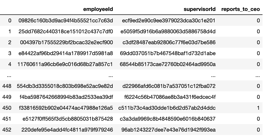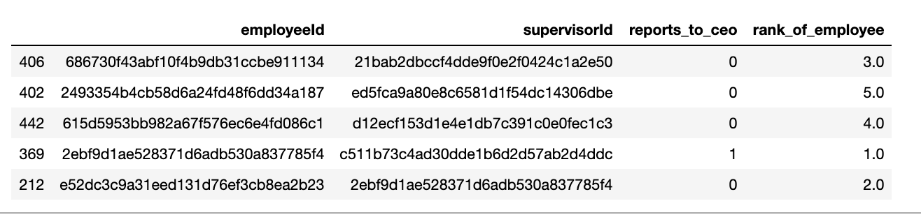 我想要生成一个新的列,它将告诉我公司层次结构中员工的级别。例如,首席执行官的级别是0。直接向首席执行官汇报的人的职级为1,低于2...and的人,以此类推。