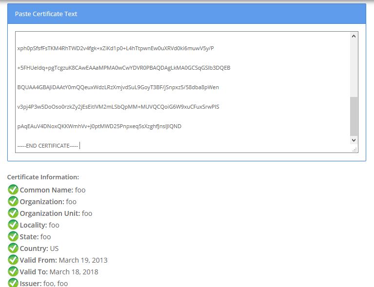 在您喜欢的编辑器中打开该.pem文件,将每个证书逐个从-----BEGIN CERTIFICATE-----复制到-----END CERTIFICATE-----并粘贴到上面的站点中。