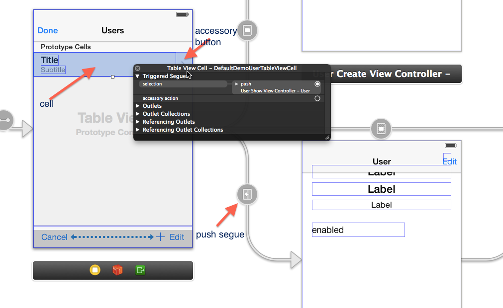 E 214”)。下面是IB中演示故事板中的一个图像,它演示了如何设置“用户”视图控制器中的“表视图单元”来触发对详细视图控制器的“推送”操作: