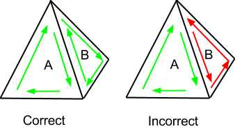 通常,顶点应该总是按逆时针顺序添加.这会导致相邻的面向相反方向指向半边,如左下方的图片所示。如果顶点的排序不一致,则在“A”的下缘或“B”的底部边缘后面有哪些边是模糊的,如右下方的图片所示。