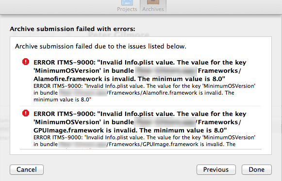有没有人用Swift和GPUImage为iOS 7+发布应用?当我试图发布一个应用程序时,我会出错(这不是我的屏幕,但我得到的是同样的)。