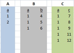 我有3个表,名为A、b和C。表a有a列。表B有a列,表c有a、c列。这些表包含如下数据: