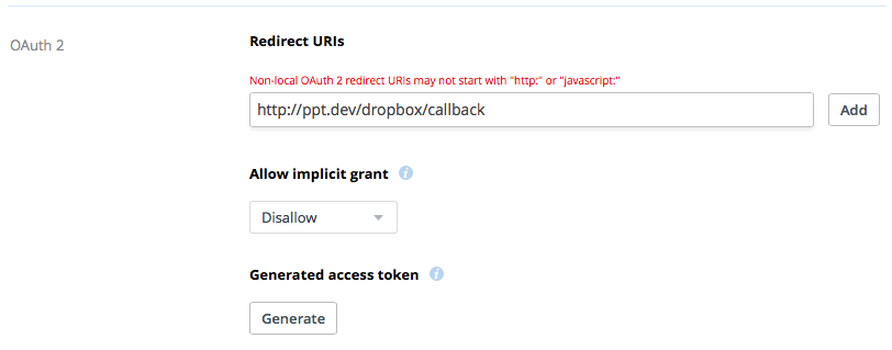 我正在试验我的第一个Dropbox集成项目。我的开发环境是Vagrant (192.168.33.10),我使用主机名ppt.dev从我的主计算机访问站点。问题是,在开发中,Dropbox只允许localhost作为redirect_uri应用程序,或者我需要给出一个以https作为重定向URI的URL。如果我给出了我的开发URI (下面给出的图像),我就得到了这个错误。