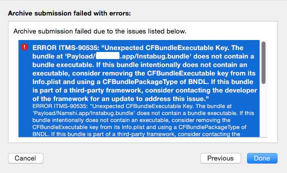 首先,我会检查一下您是否在最新版本的库中--供应商可能已经修复了这个问题。但是,如果您仍然面临这个问题,正如Sleiman所描述的,您需要从违规库的plist文件中删除CFBundleExecutable键。