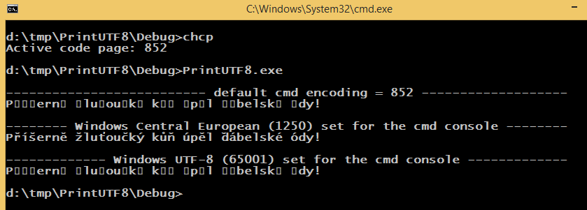 cmd默认编码为852,默认窗口编码为1250,源代码使用65001编码(UTF-8和BOM)保存。SetConsoleOutputCP(1250);以与chcp 1250相同的方式(以编程方式)更改cmd编码。