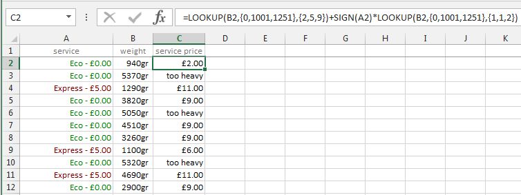 1251-5000gr=£9 eco or £11 express单元格A2和B2总是显示一个值,需要一个C2公式来显示按权重计算的服务价格,但是如果of 5以上的项目必须显示服务价格,如果低于- eco。