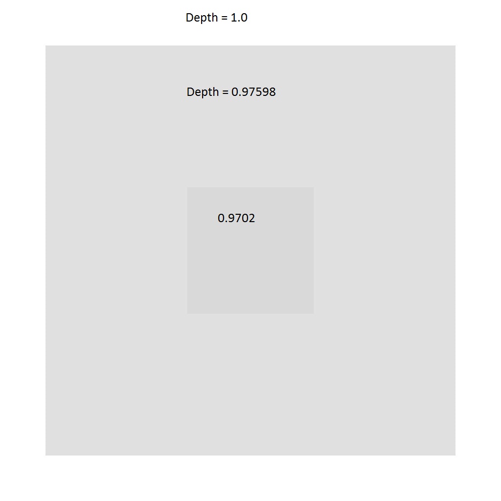 我使用32位深度缓冲区,我有两个立方体,一个在另一个后面(更大,以看到它的近邻的影子),一个光看着立方体,它们沿着z轴对齐。