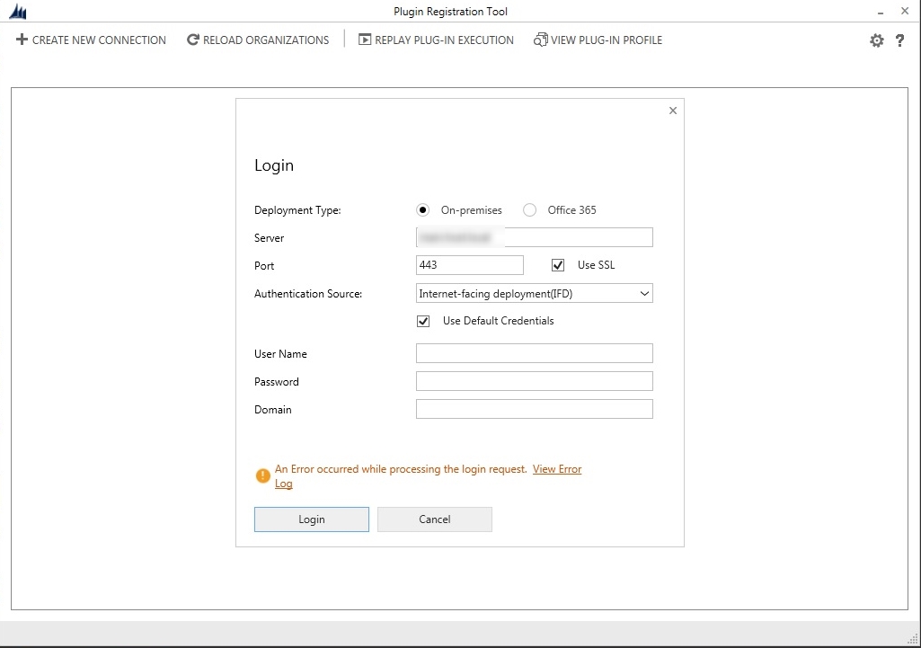 尽管如此,我不认为你可以“使用默认凭证”与IFD。对于服务器,您应该将organizationName.domainname.tld放在。对于用户名,请使用您的UPN或域\用户名。除非使用集成身份验证,否则不要同时使用域和用户名字段。