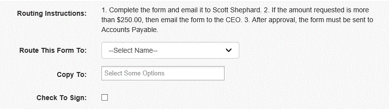 “1.填写该表格并将其发送给xxxxx@xxxxx.xom。”+ CHAR(13)+CHAR(10) + '2。如果申请金额超过$xxx.00,则将该表格发送给首席执行官。“+ CHAR(13)+CHAR(10) + '3。经批准后,必须将该表格发送给应付账款。