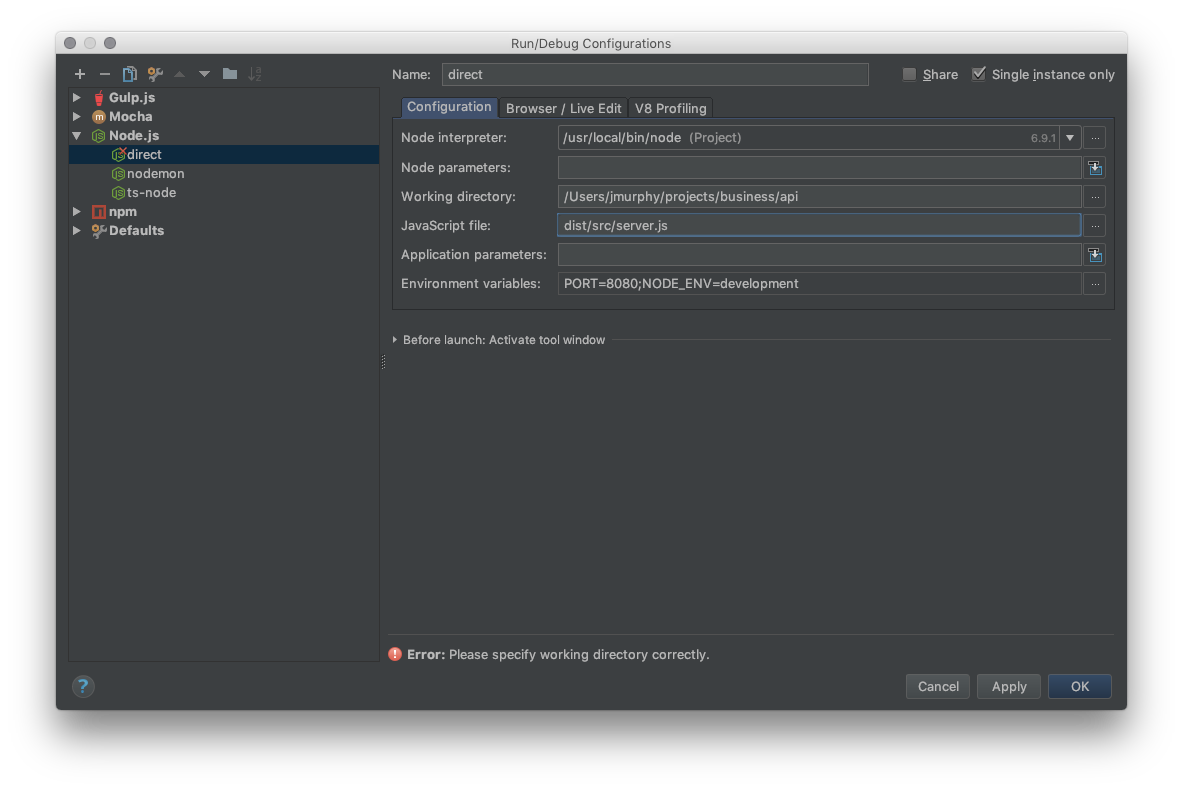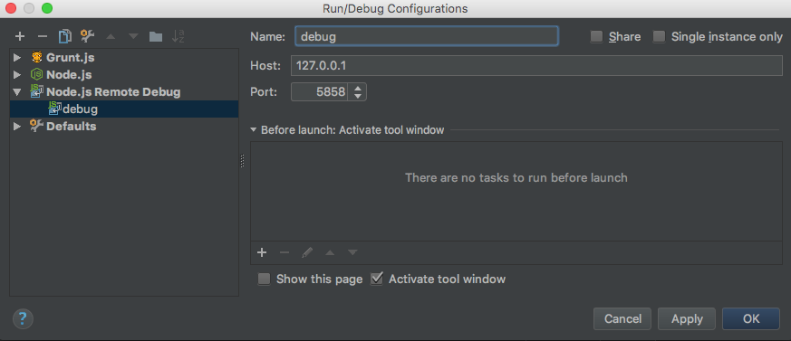 我目前解决网络风暴问题的方法是使用远程调试器。使用node --debug-brk=5858 server.js启动应用程序并添加“Node.js远程调试”配置: