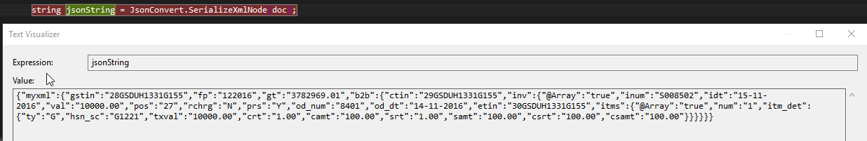 "{\"myxml\":{\"gstin\":\"28GSDUH1331G155\",\"fp\":\"122016\",\"gt\":\"3782969.01\",\"b2b\":{\"ctin\":\"29GSDUH1331G155\",\"inv\":{\"@Array\":\"true\",\"inum\":\"S008502\",\"idt\":\"15-11-2016\",\"val\":\"10000.00\",\"pos\":\"27\",\"rchrg\":\"N\",\"prs\":\"Y\",\"od_num\":\"8401\",\"od_dt\":\"14-11-2016\",\"etin\":\"30GSDUH1331G155\",\"itms\":{\"@Array\":\"true\",\"num\":\"1\",\"itm_det\":{\"ty\":\"G\",\"hsn_sc\":\"G1221\",\"txval\":\"10000.00\",\"crt\":\"1.00\",\"camt\":\"100.00\",\"srt\":\"1.00\",\"samt\":\"100.00\",\"csrt\":\"100.00\",\"csamt\":\"100.00\"}}}}}}"这些反斜杠只是作为转义字符插入,实际上并不存在。