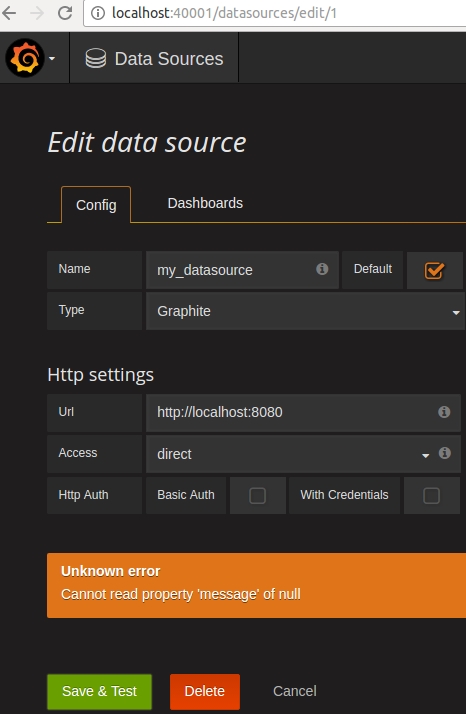 现在的想法是将容器(engie_cont)添加为DataSource。我以用户身份登录grafana : admin pass: admin,然后添加DataSource并获得错误:
