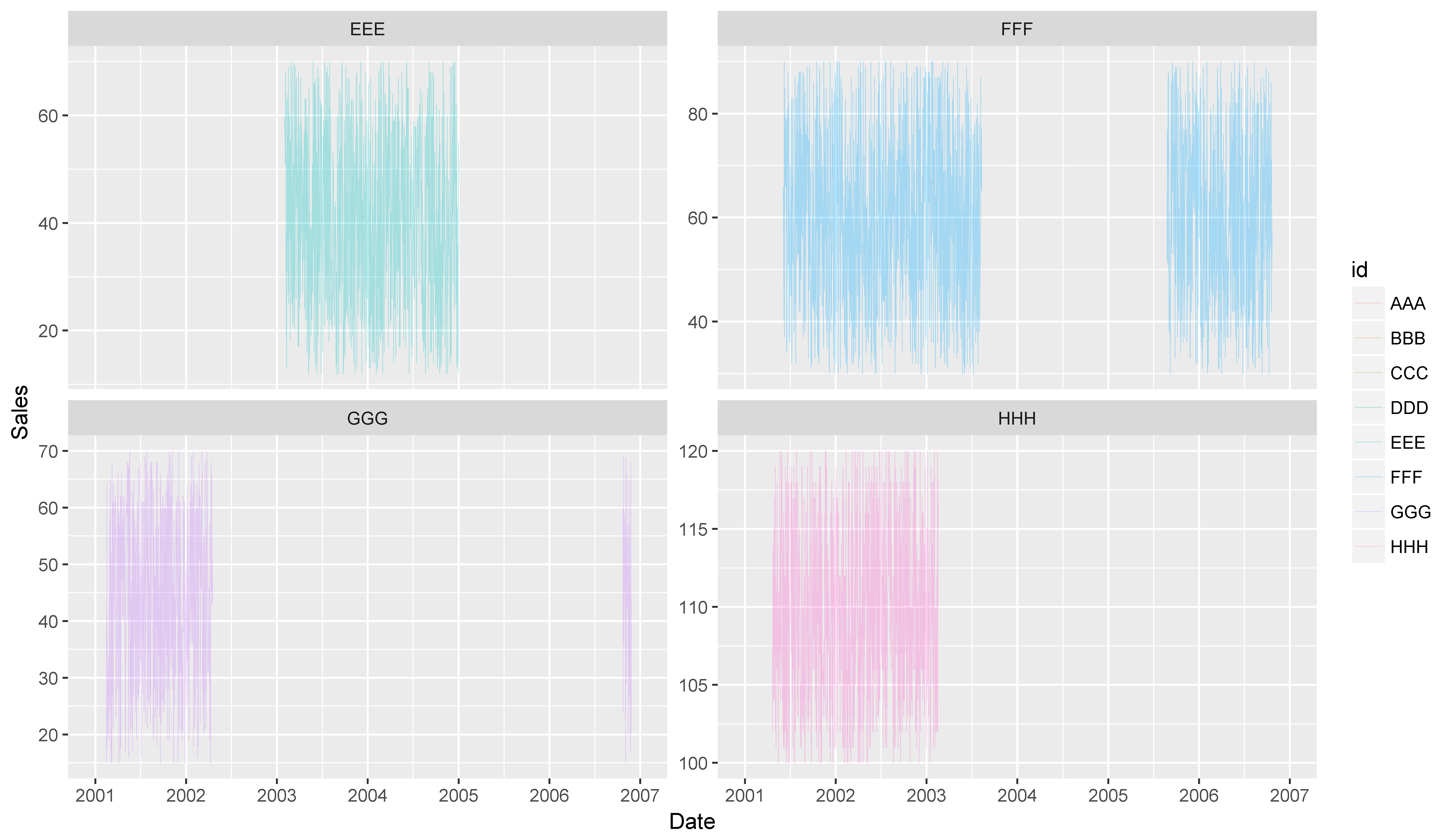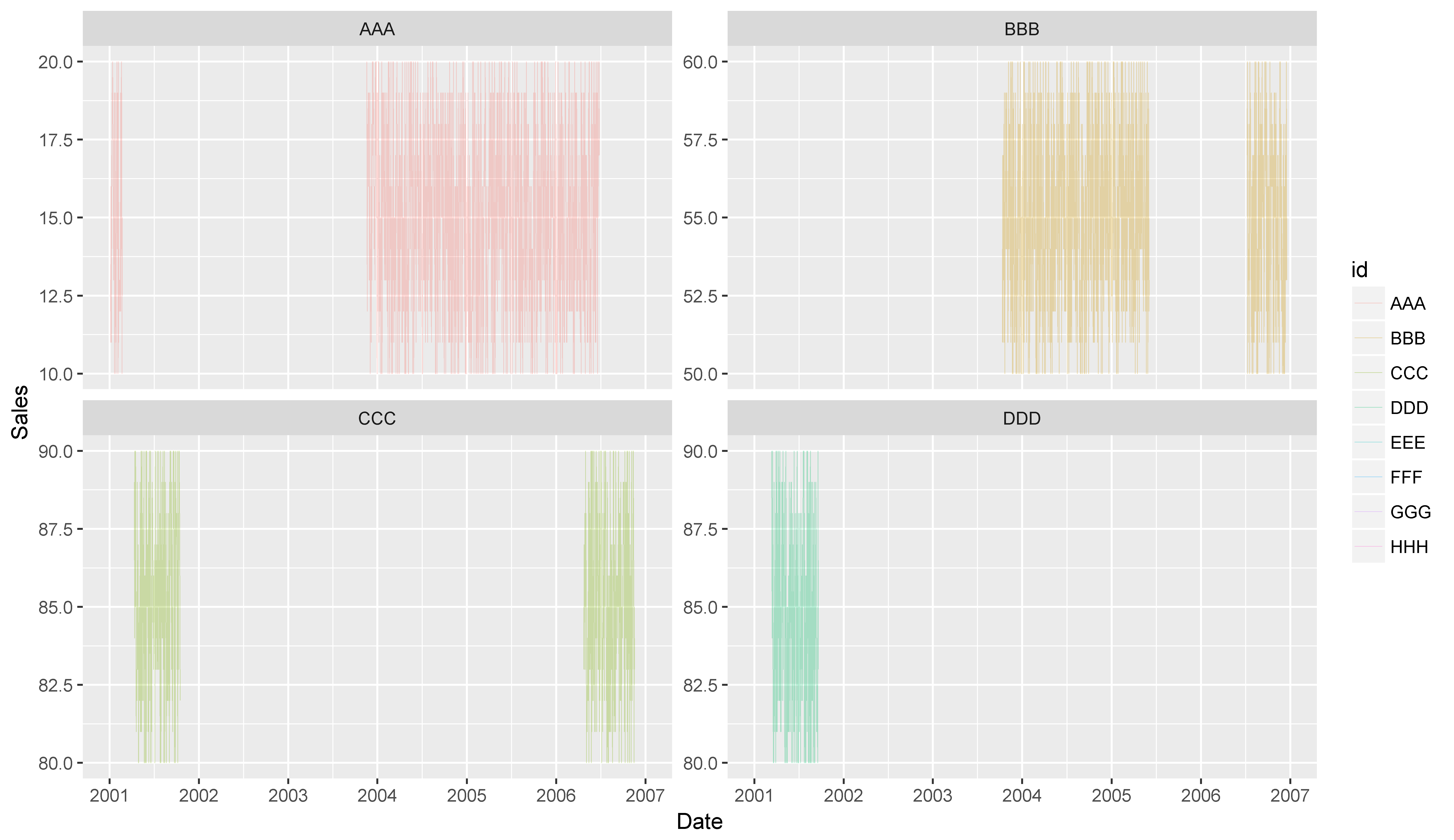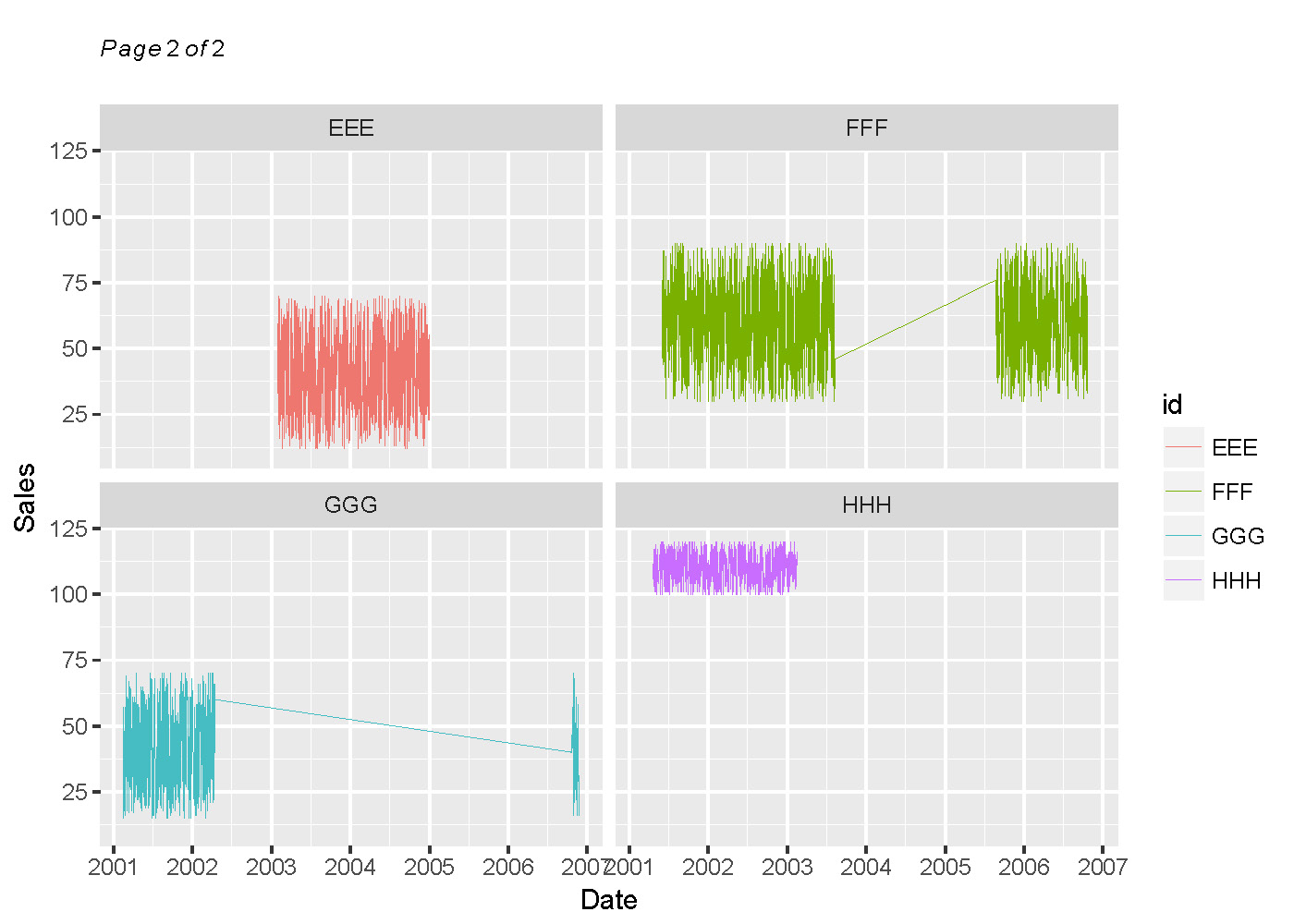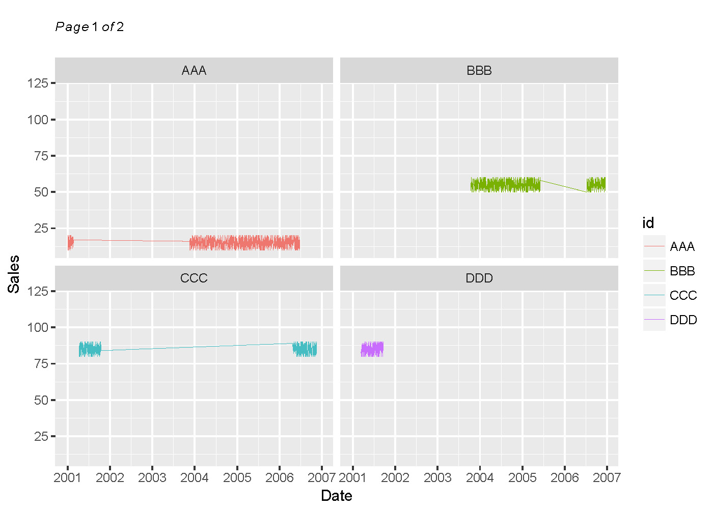 labels = date_format("%Y"))在我的原始数据中,我有30个级别的id。如果我把所有的面都画在一页上,就会很乱,也很难读懂。因此,我希望有一个情节类似于上面的情节,但只有4个方面在每一页,以便它将是可读的。