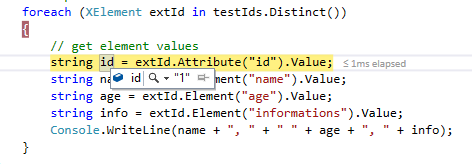 testIds = xInformations.Descendants("test").Select(x => (string)x.Attribute("id")).ToList();现在,我确实希望使用foreach来读取和保存每个id的所有信息: