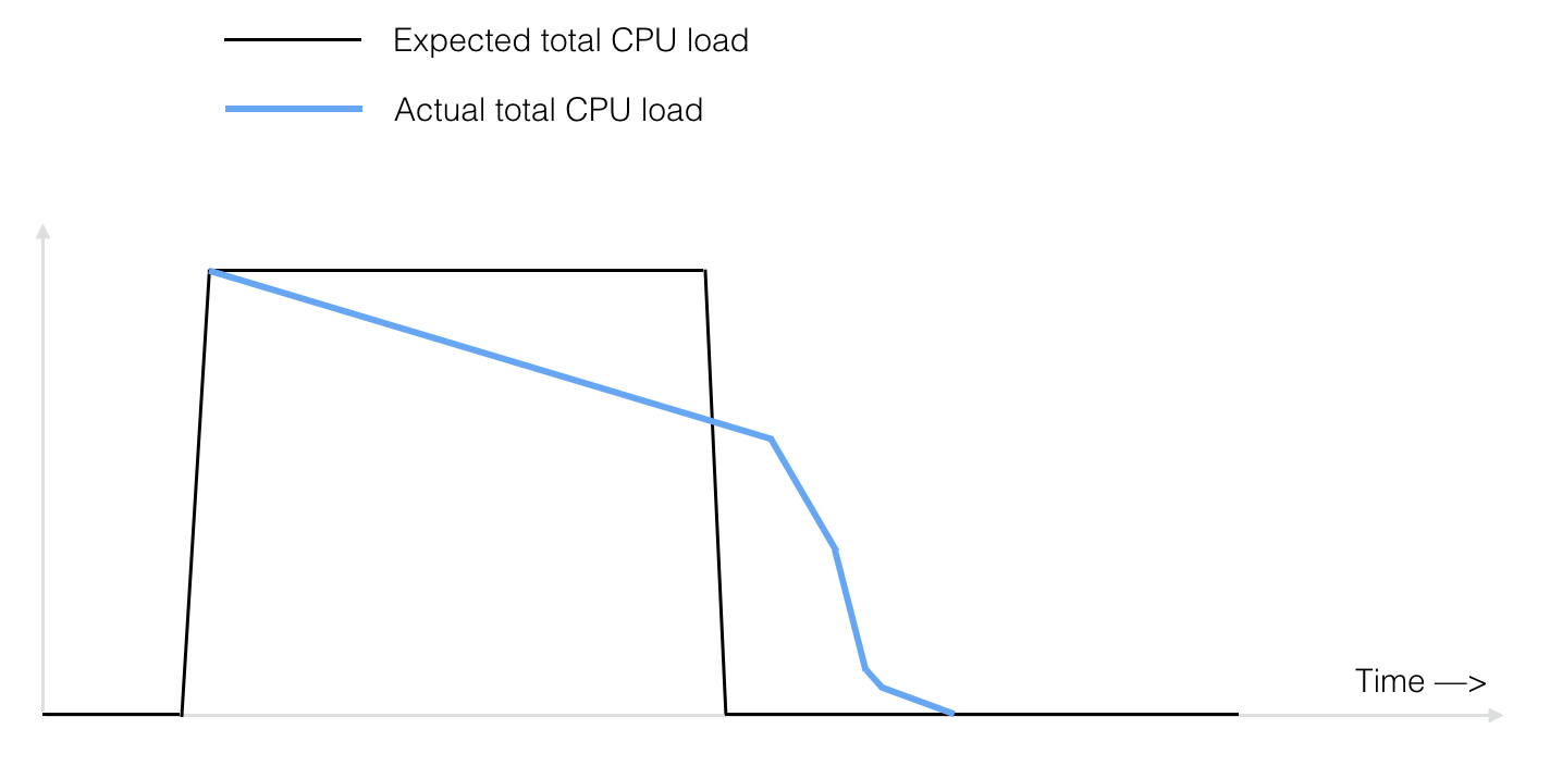 一切运行良好,然而,偷工作方面似乎不太好。下面是与实际负载(蓝色)相比较的预期总CPU负载(黑色):