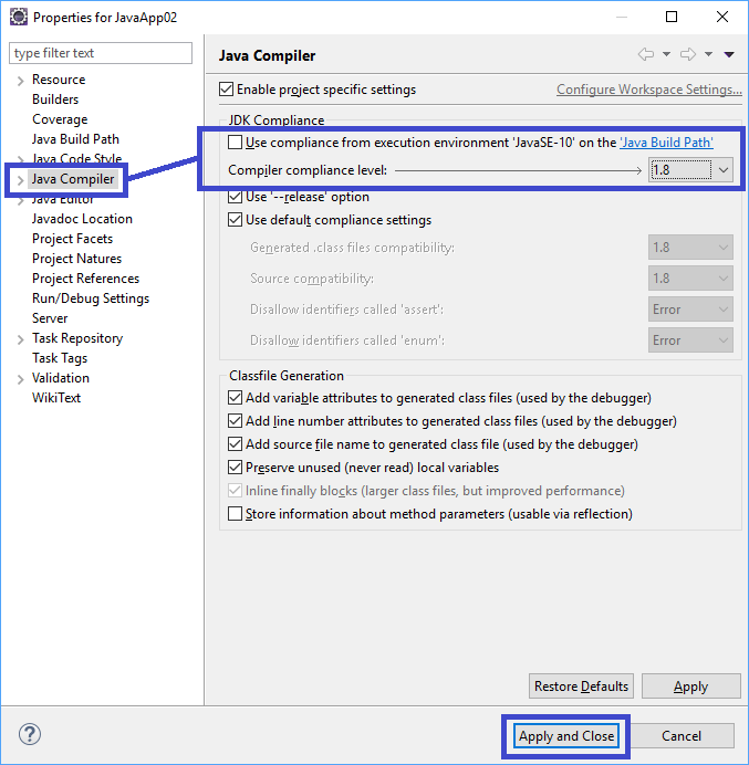 - Select 1.8 from the drop list for **Compiler compliance level**. (Presumably its current value is 10.)