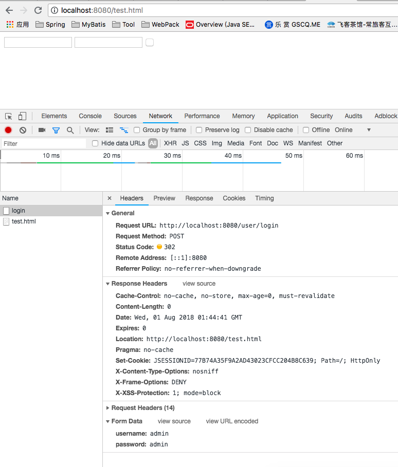 我正在尝试测试使用标准Security保护的web,但是每当我登录到我的应用程序时,/test.html API总是返回302个重定向。用户名:管理员/密码:admin