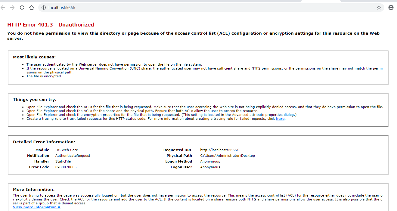 为了解决这个问题,我遵循了IIS - 401.3 - Unauthorized,但是这会导致浏览器,让我浏览目录,而不是给出服务已经创建的消息。