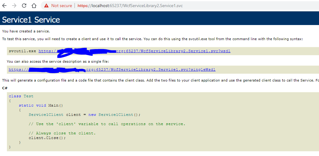 请确保切换到https并在这里选择您的证书,现在要验证您的服务是否创建了,您需要浏览您创建的网站svc文件,不幸的是此时您会发现一个错误,上面说Server Error in '/' Application. Could not find a base address that matches scheme http for the endpoint with binding BasicHttpBinding. Registered base address schemes are [https]. i找不到错误的原因,但是我找到了一个绕过它的方法,