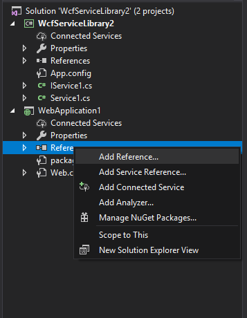 现在,您必须将其链接到一个网站,以便生成Web.Config文件和SVC文件,为此,在解决方案资源管理器上,右键单击您的解决方案,Add-> New 。