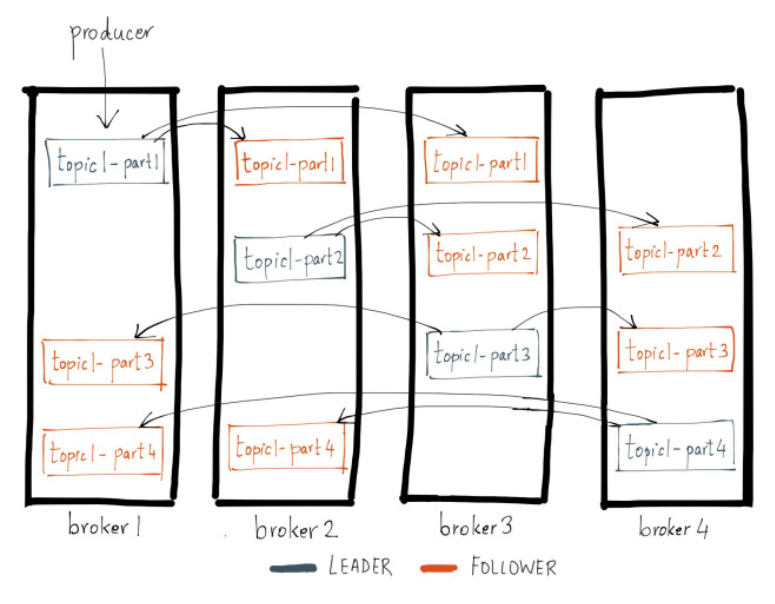 然后,分区的数据将被复制到多个代理上,如果其中一个代理脱机,用户流量将被重定向到可用的副本。